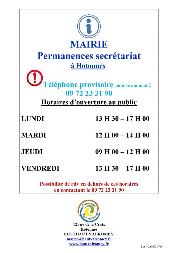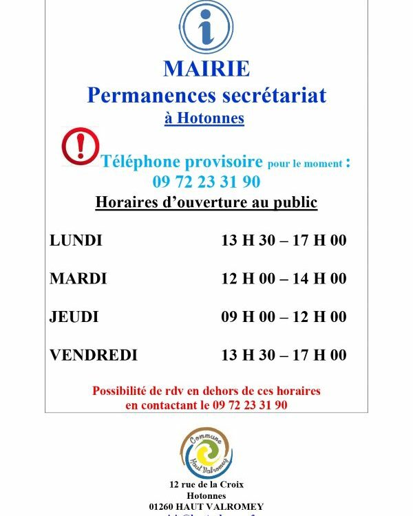 Permanences secrétariat mairie et numéro de téléphone provisoire