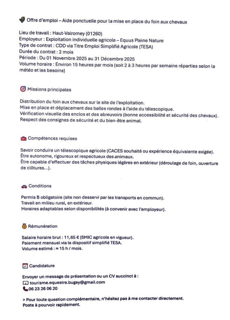Equus Pleine Nature recherche : aide ponctuelle pour la mise en place du foin aux chevaux